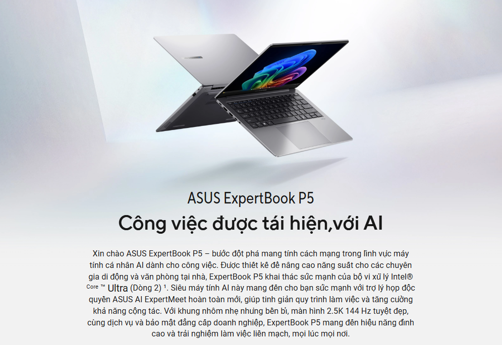 Thành phần Thông tin chi tiết Tên sản phẩm ASUS P5405CSA-NZ0016W Dòng máy ASUS ExpertBook / P-series Màu sắc Xám (Gentle Grey) Màn hình 14.0 inch WQXGA (2560 × 1600), tấm nền IPS, tỷ lệ 16:10, chống chói Bộ vi xử lý (CPU) Intel® Core™ Ultra 5-226V (kiến trúc Meteor Lake, 10 nhân / 12 luồng) Bộ nhớ (RAM) 16 GB DDR5 (Onboard) Ổ cứng (SSD) 512 GB M.2 NVMe PCIe Đồ họa (GPU) Intel Integrated Graphics (kiến trúc Intel Arc) Hệ điều hành Windows 11 Home bản quyền Kết nối không dây Wi-Fi 6E + Bluetooth 5.0 Cổng kết nối 1 x USB-C (Power Delivery + DisplayPort) 2 x USB-A 1 x HDMI 1 x RJ45 LAN 1 x jack âm thanh 3.5 mm Bảo mật Cảm biến vân tay (Fingerprint) + TPM Pin 3 cell, dung lượng 63 Wh Trọng lượng Khoảng 1.4 kg Phụ kiện đi kèm Túi xách / chuột (tùy gói bán) Bảo hành 2 năm chính hãng (OSS – Onsite Service Support)